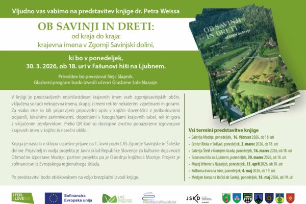 Vljudno vas vabimo na predstavitev knjige dr. Petra Weissa OB SAVINJI IN DRETI : od kraja do kraja : krajevna imena v Zgornji Savinjski dolini, ki bo v ponedeljek, 30. 3. ...