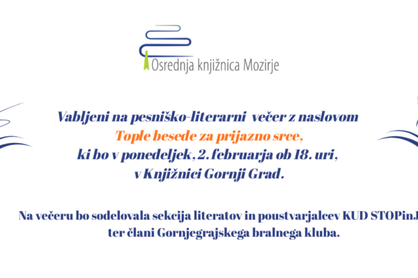 Vabljeni na pesniško-literarni večer z naslovom Tople besede za prijazno srce, ki bo v ponedeljek, 2. februarja ob 18. uri, v Knjižnici Gornji Grad. Na večeru bo sodelovala sekcija literatov ...