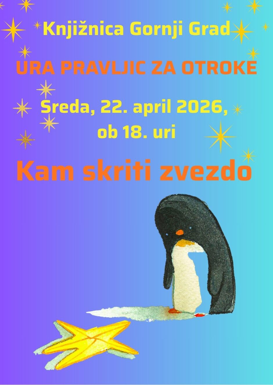 🐧⭐️Otroci, vabljeni na uro pravljic, ki bo v sredo, 22. aprila 2026 ob 18. uri v Knjižnici Gornji Grad. Skupaj bomo iskali zvezdo.⭐️⭐️