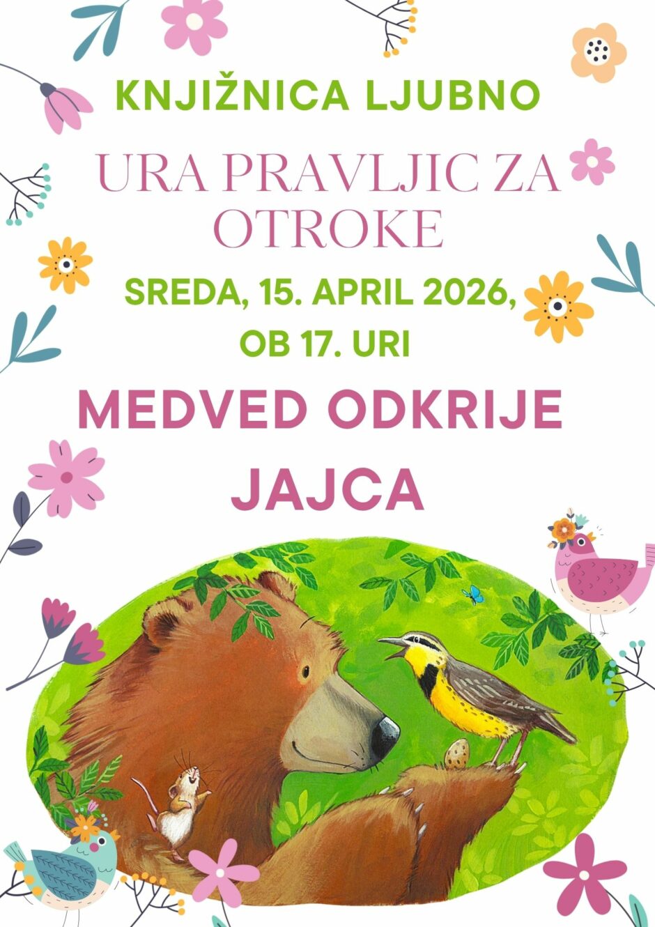🐰🪺 Otroci, vabljeni na uro pravljic, ki bo v sredo, 15. aprila 2026 ob 17. uri v Knjižnici Ljubno. Zanimalo nas bo, kam so izginila jajca. 🐻
