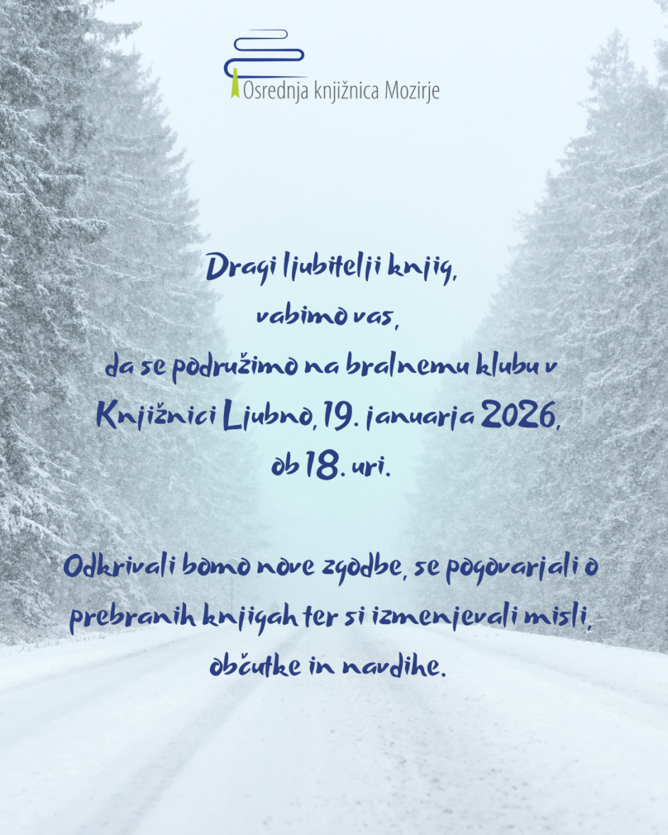 📚Vabimo vas, da se nam pridružite na Bralnem klubu Ljubno, v ponedeljek, 19. januarja 2026, ob 18. uri v prostorih Knjižnice Ljubno. 📚