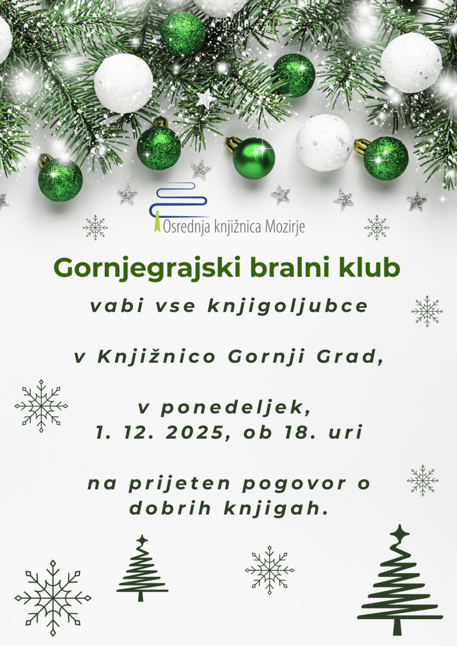 Vabljeni na zadnje srečanje Gornjegrajskega bralnega kluba v tem letu, ki bo v ponedeljek, 1. decembra 2025, ob 18. uri v Knjižnici Gornji Grad.