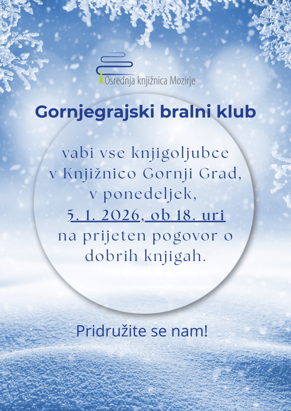 Vabljeni na srečanje Gornjegrajskega bralnega kluba, ki bo v ponedeljek, 5. januarja 2026, ob 18. uri v Knjižnici Gornji Grad.