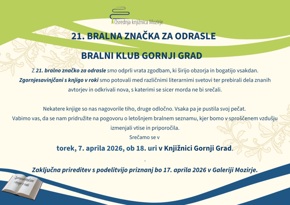 📚V torek, 7. 4. 2026, ob 18. uri vabljeni v Knjižnico Gornji Grad na bralni klub in pogovor o letošnjem bralnem seznamu v okviru 21. bralne značke za odrasle.📚