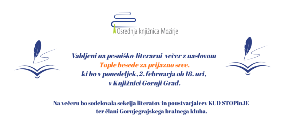 Vabljeni na pesniško-literarni večer z naslovom Tople besede za prijazno srce, ki bo v ponedeljek, 2. februarja ob 18. uri, v Knjižnici Gornji Grad.