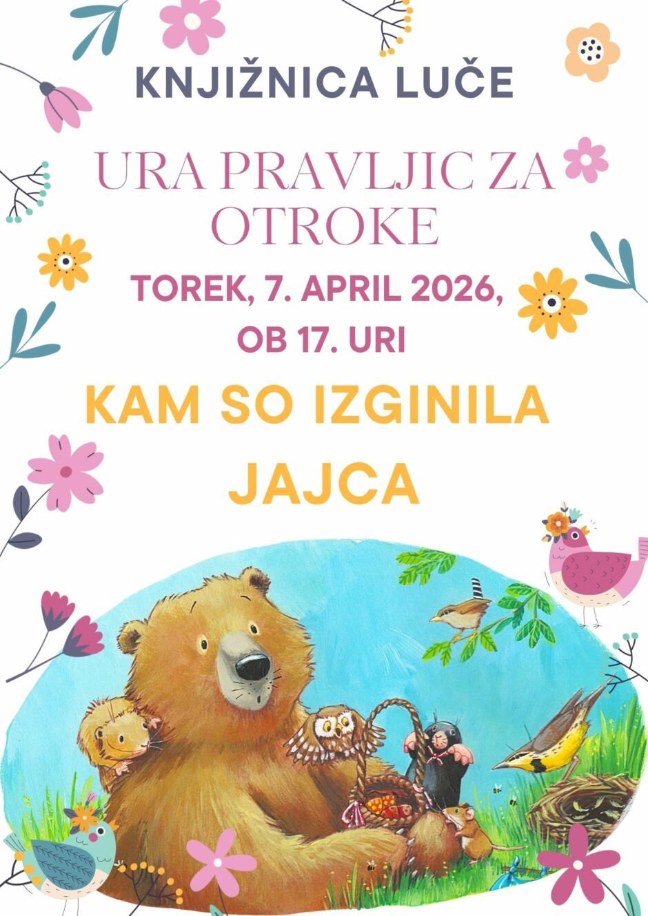 🐰🪺 Otroci, vabljeni na uro pravljic, ki bo v torek, 7. aprila 2026 ob 17. uri v Knjižnici Luče. Zanimalo nas bo, kam so izginila jajca. 🐻
